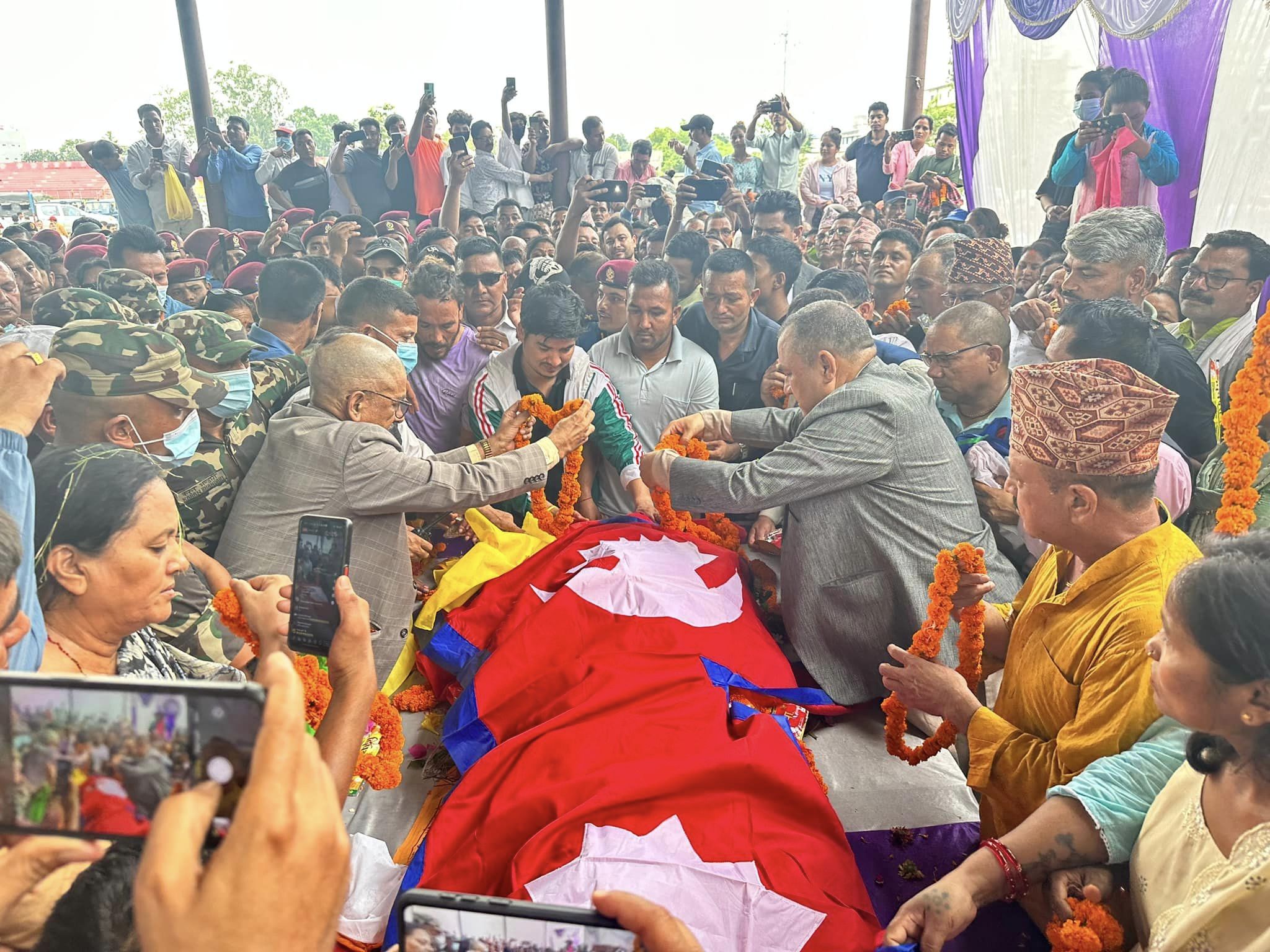 सुदूरपश्चिम प्रदेशका प्रदेश प्रमुख देवराज जोशी, मुख्यमन्त्री कमलबहादुर शाह र सभामुख भीमबहादुर भण्डारीले राष्ट्रिय झण्डा ओढाएर श्रद्धाञ्जली दिएका हुन् ।